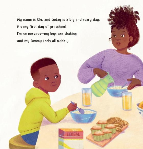 First-day-of-school fears are eased when a child discovers his new teacher is warm and approachable—and looks like him—in a tender picture-book debut.Olu is nervous about going to school for the first time—his legs are shaking and his tummy feels wobbly. He knows his friends will be there, but he doesn’t know what the teacher will be like. What do