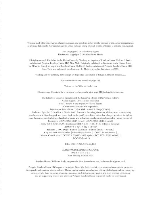 An enthralling novel for all ages by award-winning author Dave Eggers, told from the perspective of one uniquely endearing dog—featuring beautiful artwork from Caldecott honoree Shawn Harris.“Johannes is a highly engaging narrator whose exuberance and good nature run like a bright thread through the novel’s pages.” —The New York TimesJohannes, a free dog, lives in an urban park by the sea. His job is to be the Eyes—to see everything that happens within the park and report back to the park’s elders, three ancient Bison. His friends—a seagull, a raccoon, a squirrel, and a pelican—work with him as the Assistant Eyes, observing the humans and other animals who share the park and making sure the Equilibrium is in balance.