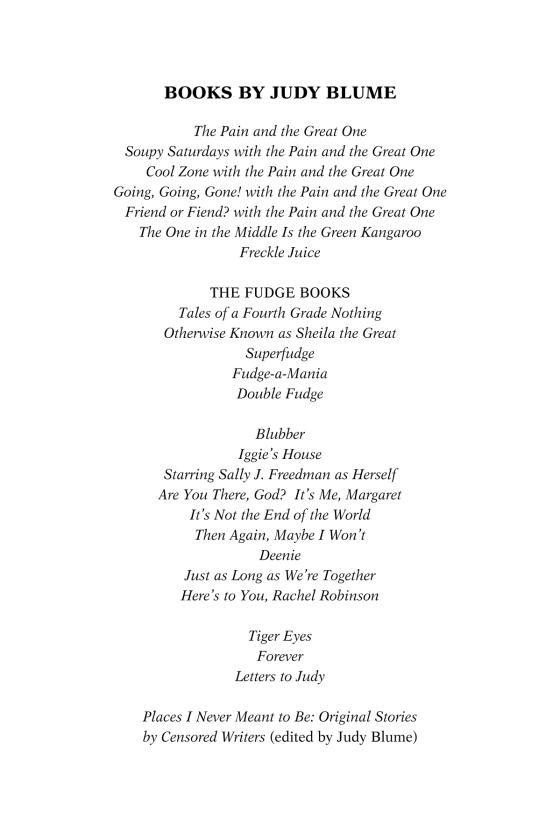 JUDY BLUME spent her childhood in Elizabeth, New Jersey, making up stories inside her head. She spent her adult years in many places, doing the same thing, only now she writes her stories down on paper. Her numerous books have won many awards, including the National Book Foundation’s Medal for Distinguished Contribution to American Letters.
