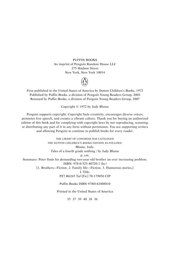 Tales of a Fourth Grade Nothing is the first in a five-book series about Peter, Fudge, and Sheila. Judy lives with her husband in Key West and New York City. You can visit her at judyblume.com.