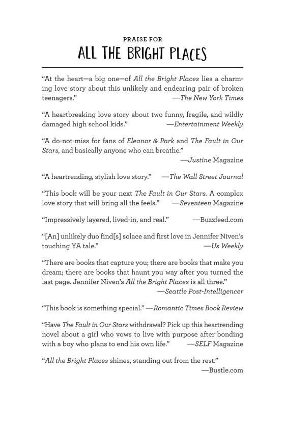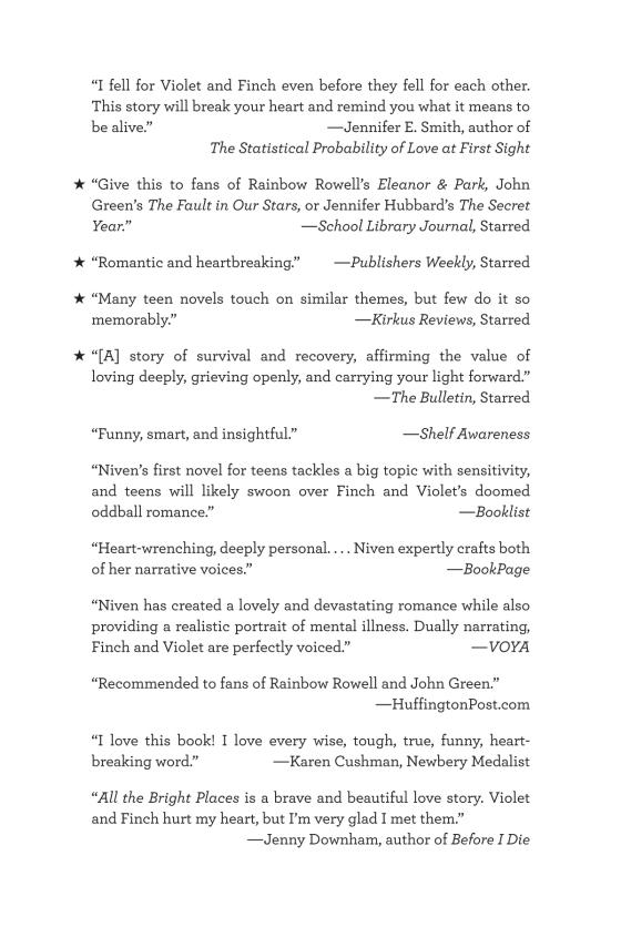 "In her YA debut, adult author Niven creates a romance so fresh and funny. . . The journey to, through, and past tragedy is romantic and heartbreaking, as characters and readers confront darkness, joy, and the possibilities—and limits—of love in the face of mental illness.”