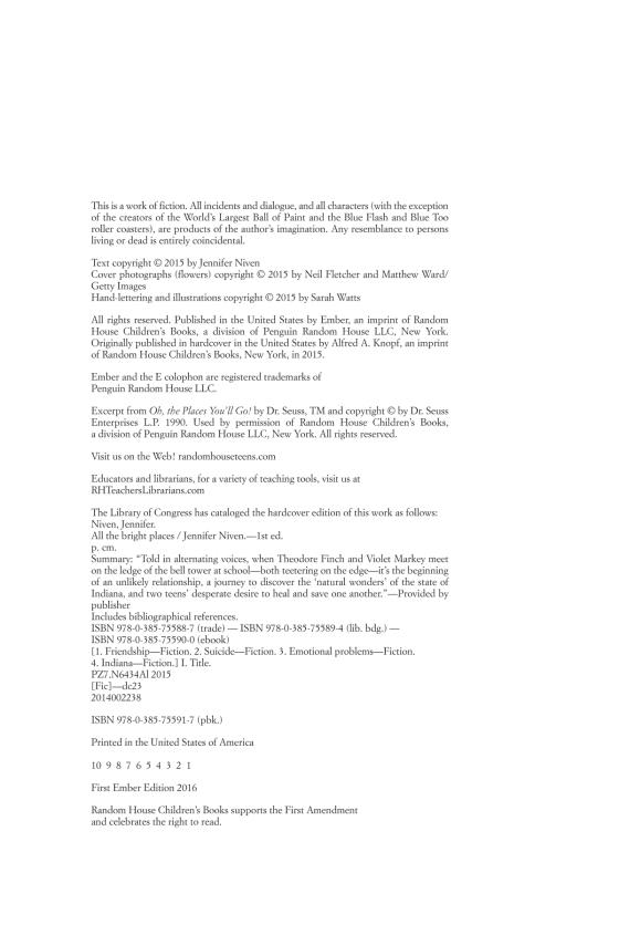 Theodore Finch is fascinated by death. Every day he thinks of ways he might kill himself, but every day he also searches for—and manages to find—