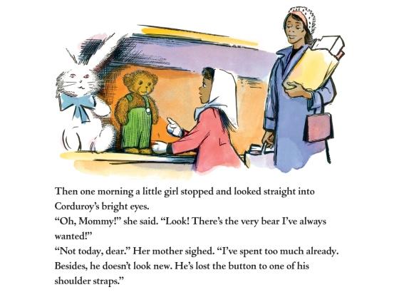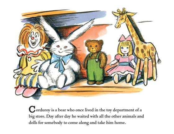 Corduroy lives in the toy department of a big store. Day after day he waits with all the other animals and dolls for somebody to come along and take him home. Yet as soon as Lisa sees him, she knows that he’s the bear for her. Her mother, though, thinks he’s a little shopworn—he’s even missing a button! Still, Corduroy knows that with a bit of work he can tidy himself up and be just the bear for Lisa.