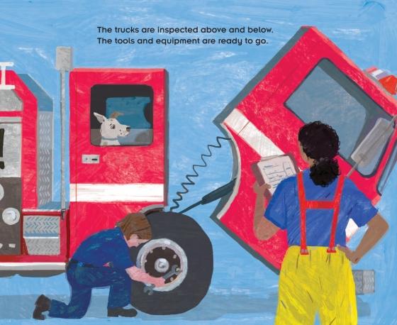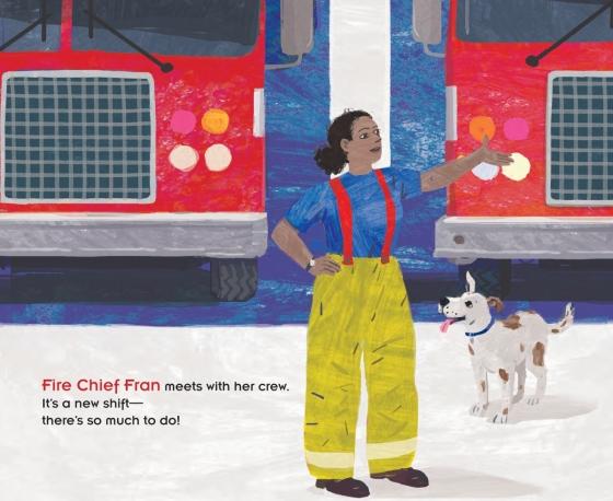 ★ "Fire Chief Fran leads a crew of firefighters, and a trusty firehouse dog, through a busy shift of wide-ranging calls, linked by Ashman’s rousing, rhyming refrain: 'Lights begin flashing, and—CLANG!—the bells blast./ They leap into action—/ they need to move FAST!'...Carpenter’s striking, digitally finished acrylic art combines a primary-colors palette with tissue-paper texturing...Together with its detailed, q&a-style afterword, it’s a first-rate portrayal of first responders." —