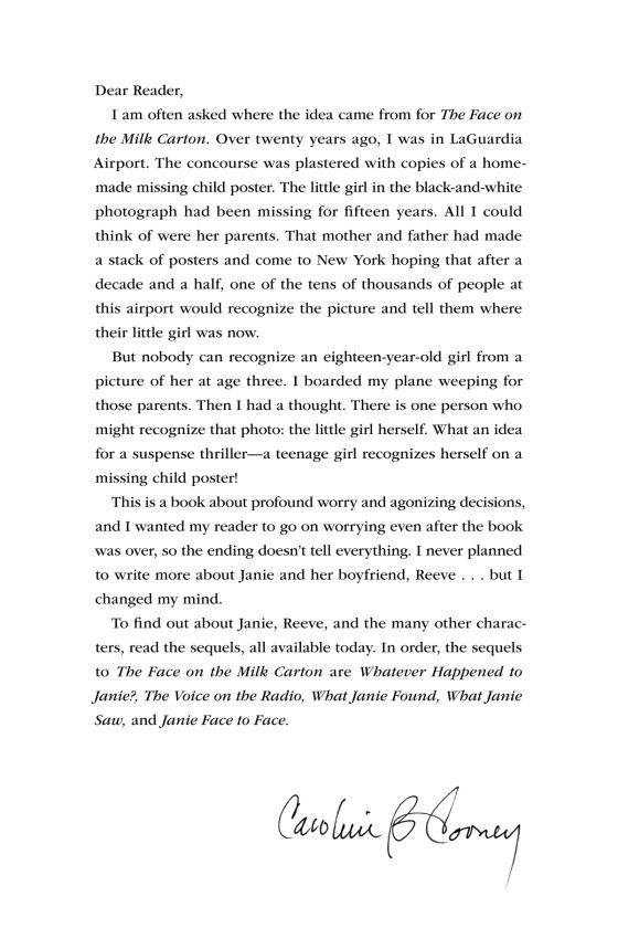 Praise for the Janie Johnson series:The Face on the Milk Carton • An IRA-CBC Children’s Choice