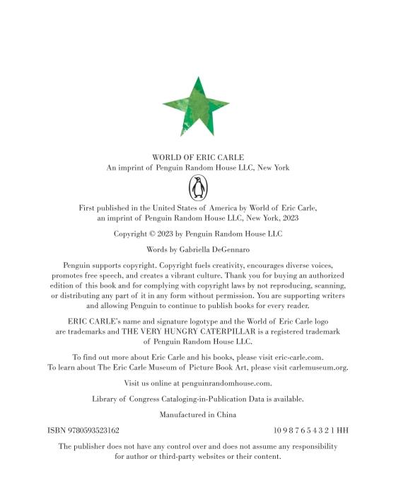 The Very Hungry Caterpillar, has been translated into 70 languages and sold over 55 million copies. Carle illustrated more than seventy books, many best sellers, most of which he also wrote, and more than 170 million copies of his books have sold around the world. In 2003, Carle received the Laura Ingalls Wilder Award (now called the Children’s Literature Legacy Award) for lifetime achievement in children's literature. In 2002, Eric and his wife, Barbara, cofounded The Eric Carle Museum of Picture Book Art (www.carlemuseum.org) in Amherst, Massachusetts, a 40,000-square-foot space dedicated to the celebration of picture books and picture book illustrations from around the world, underscoring the cultural, historical, and artistic significance of picture books and their art form. Eric Carle passed away in May 2021 at the age of 91. His work remains an important influence on artists and illustrators at work today. www.eric-carle.com