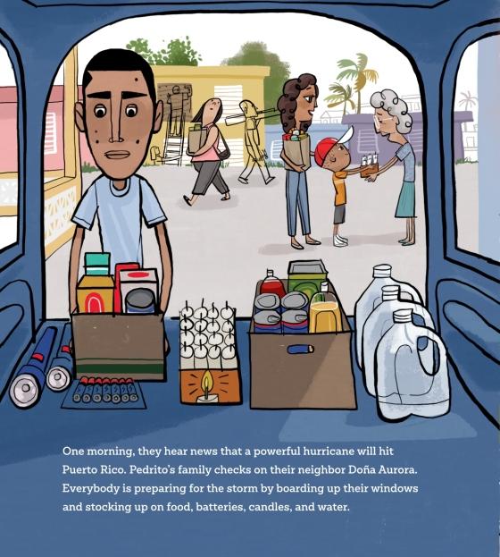 “Cartoon-like illustrations in vibrant, buoyant colors are sure to capture the attention of younger listeners, while Aponte’s use of light—a sunbeam cascading in through a window, candle flames glowing white in the tension of the storm, and a warm orange sunrise as the community rallies and sings together—adds emotional resonance that older audiences will appreciate. Aponte also writes the Spanish edition of the book, and both versions are equally enjoyable, with humor built into both the text and the illustration, such as Antonio’s joke about debris from the storm making the street look like Pedro’s room and the disgruntled countenance on the little dog’s face as she’s deprived of the opportunity to chew things. . . . There’s enough community and warmth to keep this story hopeful until the family is reunited.” —