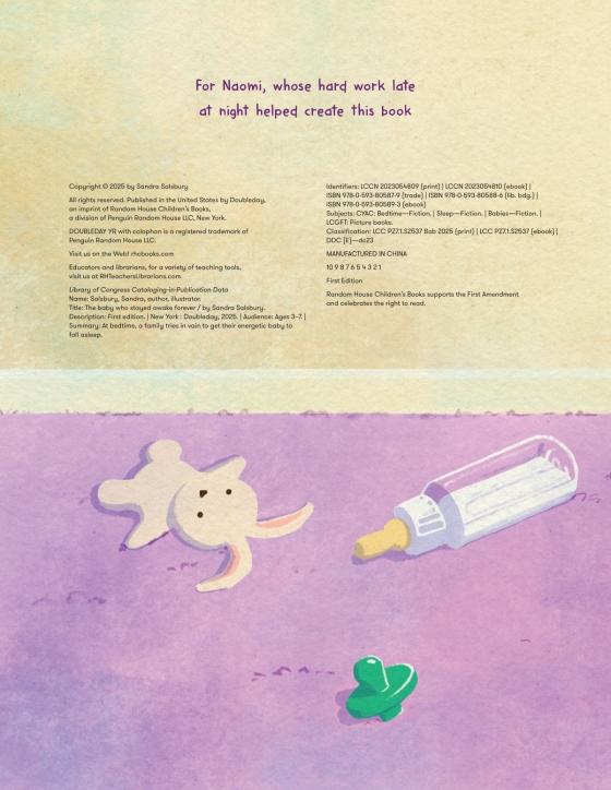 SANDRA SALSBURY is the author and illustrator of Best Friend in the Whole World and Spreckle’s Snack Surprise. She was born and raised in the San Francisco Bay Area, where she received a BFA and MFA in illustration from the Academy of Art University. Most days you can find her at home in Berkeley with her husband and daughter. The Baby Who Stayed Awake Forever was written using the Notes app at 2am, while huddled in the corner of a nursery.