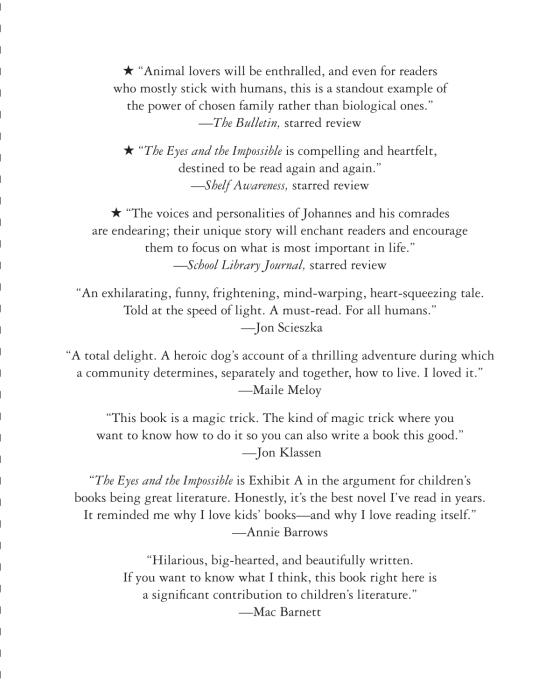 An enthralling novel for all ages by award-winning author Dave Eggers, told from the perspective of one uniquely endearing dog—featuring beautiful artwork from Caldecott honoree Shawn Harris.“Johannes is a highly engaging narrator whose exuberance and good nature run like a bright thread through the novel’s pages.” —The New York TimesJohannes, a free dog, lives in an urban park by the sea. His job is to be the Eyes—to see everything that happens within the park and report back to the park’s elders, three ancient Bison. His friends—a seagull, a raccoon, a squirrel, and a pelican—work with him as the Assistant Eyes, observing the humans and other animals who share the park and making sure the Equilibrium is in balance.