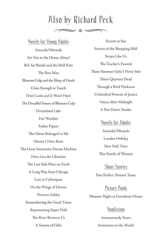 RICHARD PECK (1934-2018) was born in Decatur, Illinois and lived in New York City for nearly 50 years. The acclaimed author of 35 novels for children and young adults, he won the Newbery Medal for