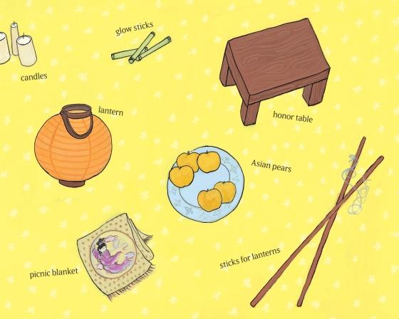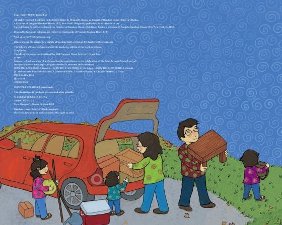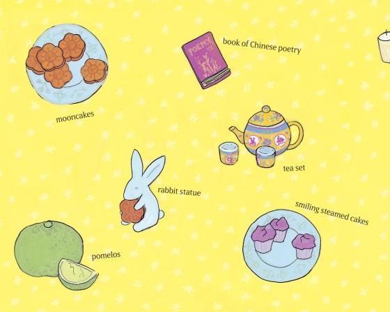 Each member of the family lends a hand as they prepare a moonlit picnic with mooncakes, pomelos, cups of tea, and colorful lanterns. And everyone sends thanks and a secret wish up to the moon.