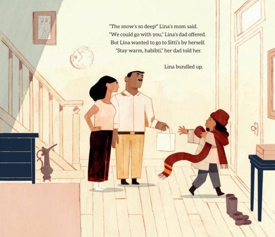 A snowy day, a trip to Grandma's, time spent cooking with one another, and space to pause and discover the world around you come together in this perfect book for reading and sharing on a cozy winter day.One winter morning, Lina wakes up to silence. It's the sound of snow -- the kind that looks soft and glows bright in the winter sun. But as she walks to her grandmother's house to help make the family recipe for warak enab, she continues to listen.