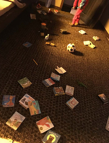 If readers look closely, they’ll see the types of toys he likes to play with, activities he likes to do, and even real books he likes to read. There are also several toy train cars that look like the cars he’s about to count, as well as some other hints that suggest what is to come, too!