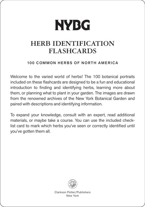 New York Botanical Garden Herb Identification Flashcards makes it easy to identify your botanical findings and decide how they can best be used. The deck also includes a title card showing key features on each flashcard as well as a checklist of all the herbs in the deck. The laminated cards easily wipe clean after a romp through the meadows or a day in the kitchen, and the convenient size makes it easy to bring one or two to if you're shopping for herbs or toss the whole deck into a daypack for a hike. You can also use the cards to help plan your herb garden or just enjoy the exquisite artwork from the archives of the New York Botanical Garden.