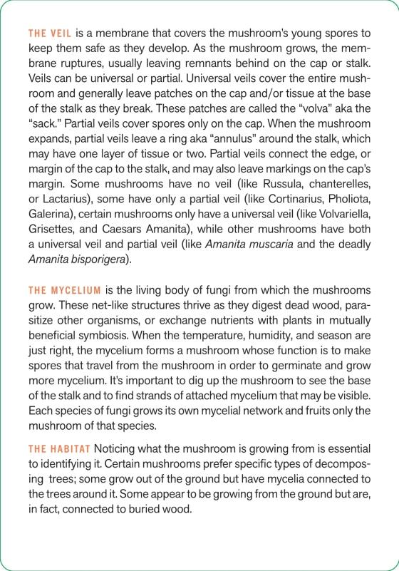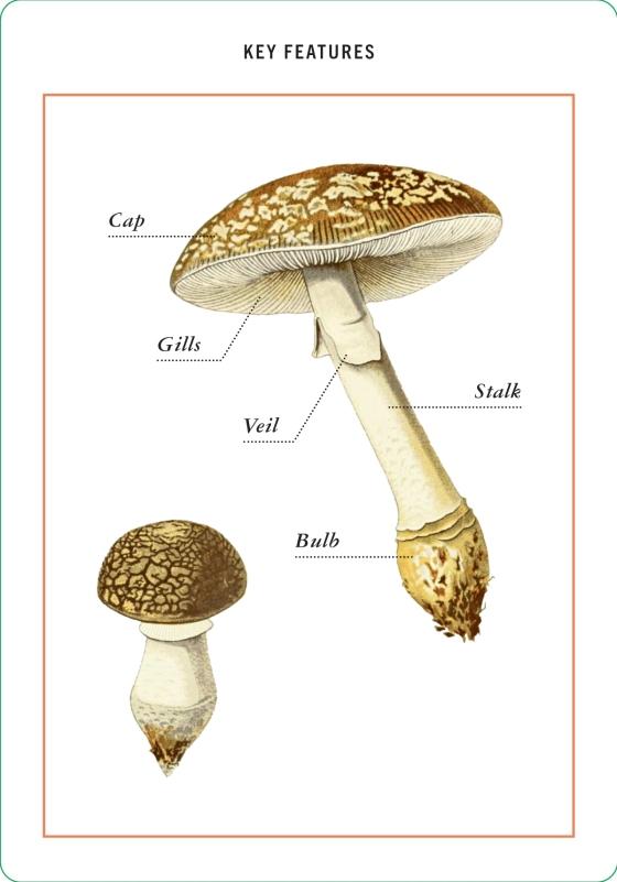 • key identifiers, such as the mushroom’s gills, spore, bulb, and cap